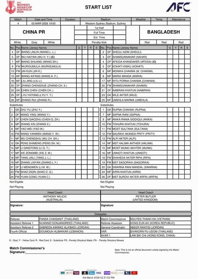 北京时间3月3日16点,作为本届女足亚洲杯卫冕冠军的中国女足将迎战首个对手孟加拉国女足,双方赛前公布首发名单。
